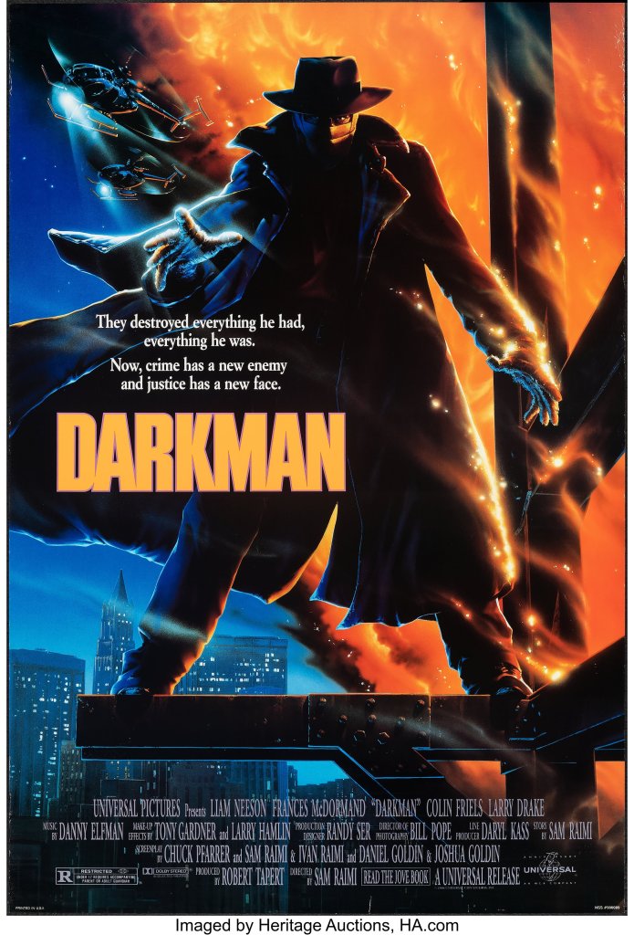 The film’s called Darkman, and it’s a horror/action/superhero/crime film starring Liam Neeson in an early action movie for him.