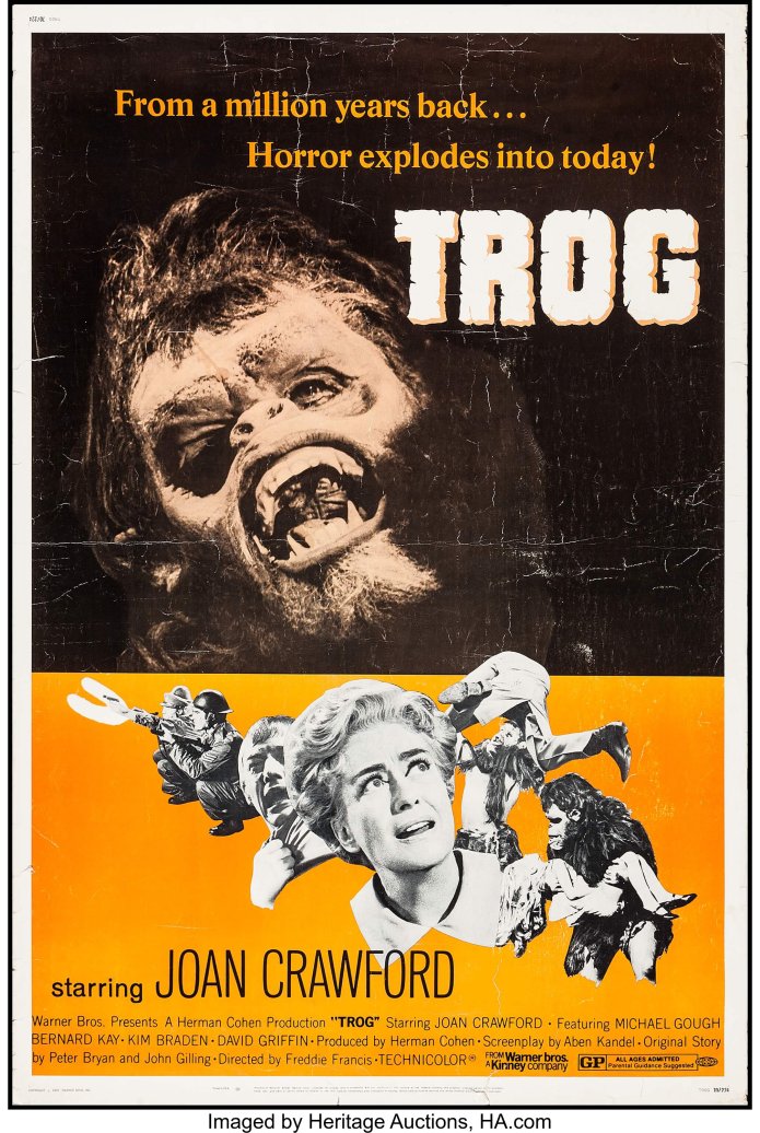 Her final movie performance is a perfect example of this, as Crawford appeared in a film called Trog. A primitive being was discovered in an underground cave and is taken by the scientist Dr. Brockton (Joan Crawford). Believing that the creature could be the missing link between human and troglodyte, Brockton began teaching, studying and working with the creature, naming him Trog.