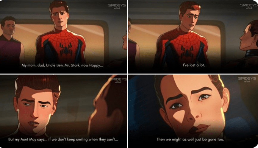 In fact, the episode specifically addresses this in one of the best scenes around. Spidey talks about how his Aunt May said to him that he had to keep smiling or else he may as well be gone. Plus, he mentioned Uncle Ben, something that the MCU has skirted around from the start of the web slinger.