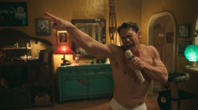 The scene where John Cena sang along in his tighty-whiteys with the song by The Quireboys called “I Don’t Love You Anymore.” Apparently, this was shot on day one of filming and it is completely off the wall.