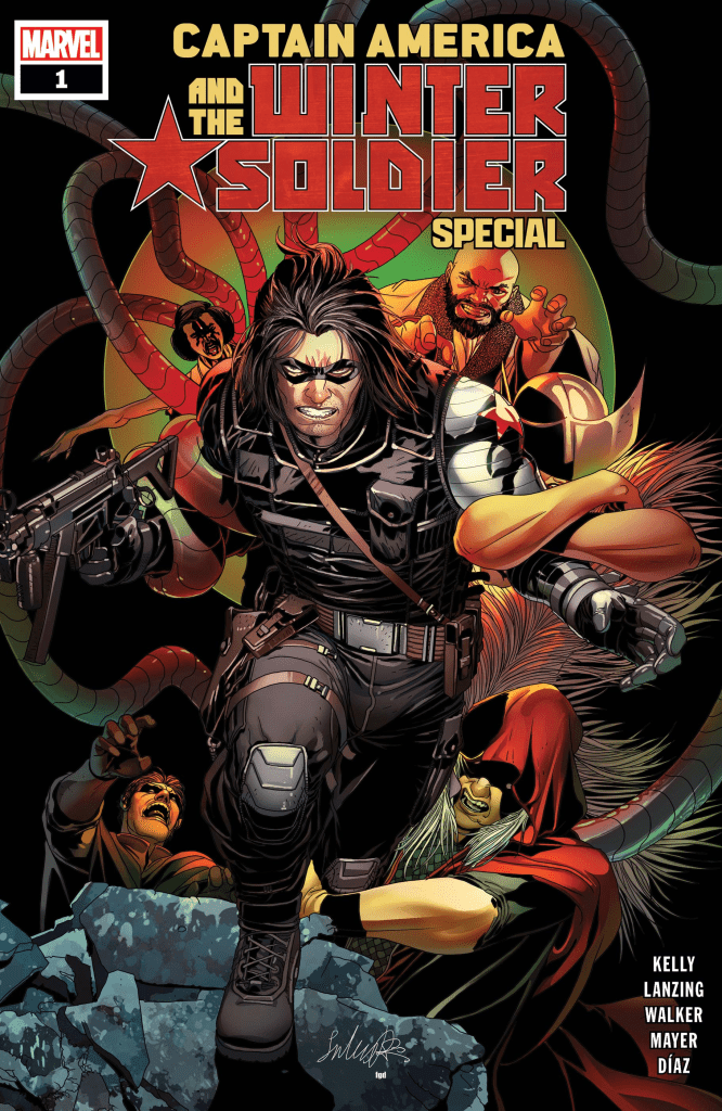 Captain America and the Winter Soldier Special #1. This book, which was written by Jackson Lanzing and Collin Kelly, with art from Kev Walker, leads into a storyline that continued in Captain America: Sentinel of Liberty #7. I’ll need to pull that out of the pile to see where it goes. This was all set up, basically, involving a group of string-pullers involved in a large scale conspiracy in the world. Somehow, Bucky joined them. Poor Bucky has been through so much in his long life. Just one more problem.