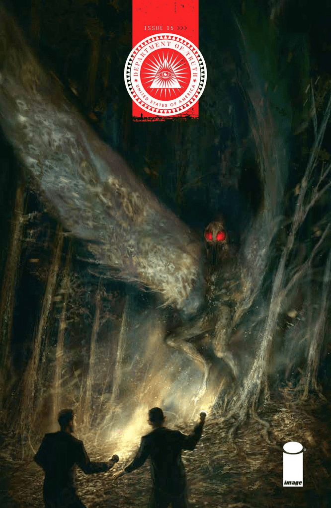The Department of Truth #15. Writer: James Tynion IV. Artist: David Romero. I have enjoyed this series quite a bit, and this issue took it to an all-new level. This issue was about the Mothman legend and it was laid out in a much different style than any other comic book I have ever seen. It felt more like an adult style picture book with the text being much of an interview being carried out with “Doc” Dalton Hynes. Who exactly was performing the interview was redacted in a cool detail. This issue introduces an awesome character named Indrid Cold and ends with Hynes making some fascinating comments about Lee. While I would not want this to be in this format regularly, this was an exceptional special issue.