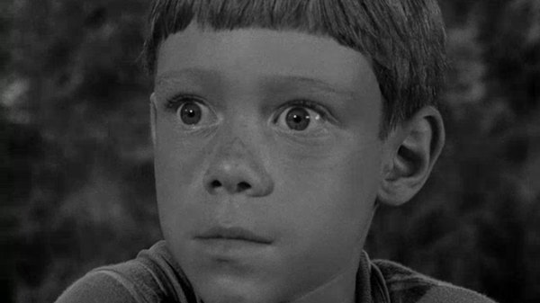 “Tonight’s story on The Twilight Zone is somewhat unique and calls for a different kind of introduction. This, as you may recognize, is a map of the United States, and there’s a little town there called Peaksville. On a given morning not too long ago, the rest of the world disappeared and Peaksville was left all alone. Its inhabitants were never sure whether the world was destroyed and only Peaksville left untouched or whether the village had somehow been taken away. They were, on the other hand, sure of one thing: the cause. A monster had arrived in the village. Just by using his mind, he took away the automobiles, the electricity, the machines—because they displeased him—and he moved an entire community back into the dark ages—just by using his mind. Now I’d like to introduce you to some of the people in Peaksville, Ohio. This is Mr. Fremont. It’s in his farmhouse that the monster resides. This is Mrs. Fremont. And this is Aunt Amy, who probably had more control over the monster in the beginning than almost anyone. But one day she forgot. She began to sing aloud. Now, the monster doesn’t like singing, so his mind snapped at her, turned her into the smiling, vacant thing you’re looking at now. She sings no more. And you’ll note that the people in Peaksville, Ohio have to smile. They have to think happy thoughts and say happy things because, once displeased, the monster can wish them into a cornfield or change them into a grotesque, walking horror. This particular monster can read minds, you see. He knows every thought, he can feel every emotion. Oh yes, I did forget something, didn’t I? I forgot to introduce you to the monster. This is the monster. His name is Anthony Fremont. He’s six years old, with a cute little-boy face and blue, guileless eyes. But when those eyes look at you, you’d better start thinking happy thoughts, because the mind behind them is absolutely in charge. This is the Twilight Zone.”