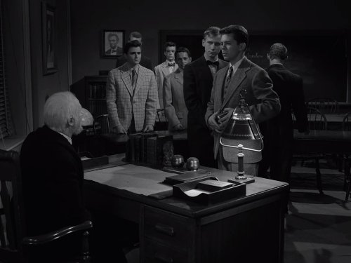 “Professor Ellis Fowler, a gentle, bookish guide to the young, who is about to discover that life still has certain surprises, and that the campus of the Rock Spring School for Boys lies on a direct path to another institution, commonly referred to as the Twilight Zone.”