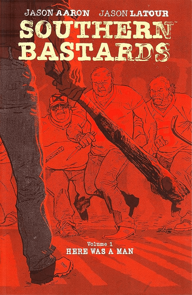 Then, I picked up a trade paper back of Southern Bastards: Volume 1: Here Was A Man by Jason Aaron and Jason Latour. I had heard about Southern Bastards before but never picked it up. This trade paperback collected issues #1-4 of the award winning series. I knew I was in for something different on page one as we see a dog pooping. This was brutal and very well written. Earl Tubb came back to his hometown to wrap up his father’s old house because his uncle (who was living there since Tubb’s father had died)went to an old folks home. Earl Tubb cambe back into town to find that everything is being run by Coach Boss, the local football coach, and everyone is looking the other way. This was sensational and I might have to look into finding the full series, not just being happy with the trades.