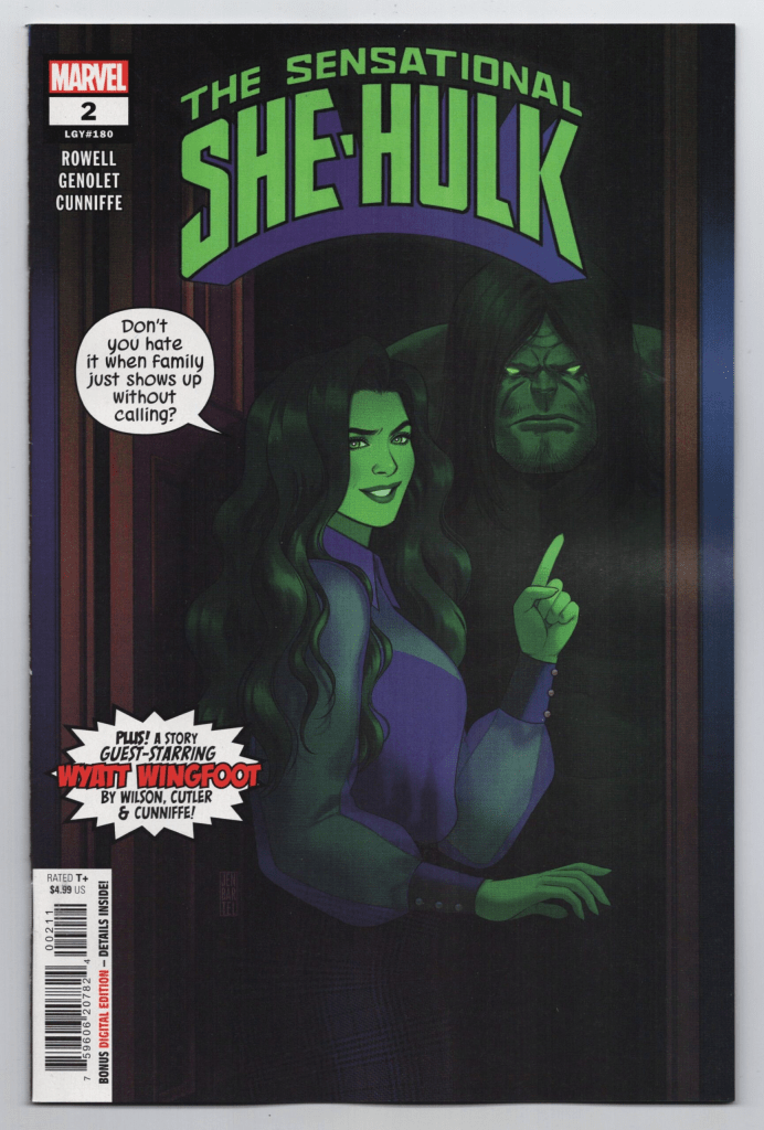 The Sensational She-Hulk #2. “Jen-Sational! Part 2” Written by Rainbow Rowell and art by Andres Genolet. Bonus Wyatt Wingfoot story was written by Bobby Wilson and art from David Cutler. Jen Bartel did the cover art. The Incredible Hulk makes a guest appearance with his cousin, though he doesn’t want any part of Jen.