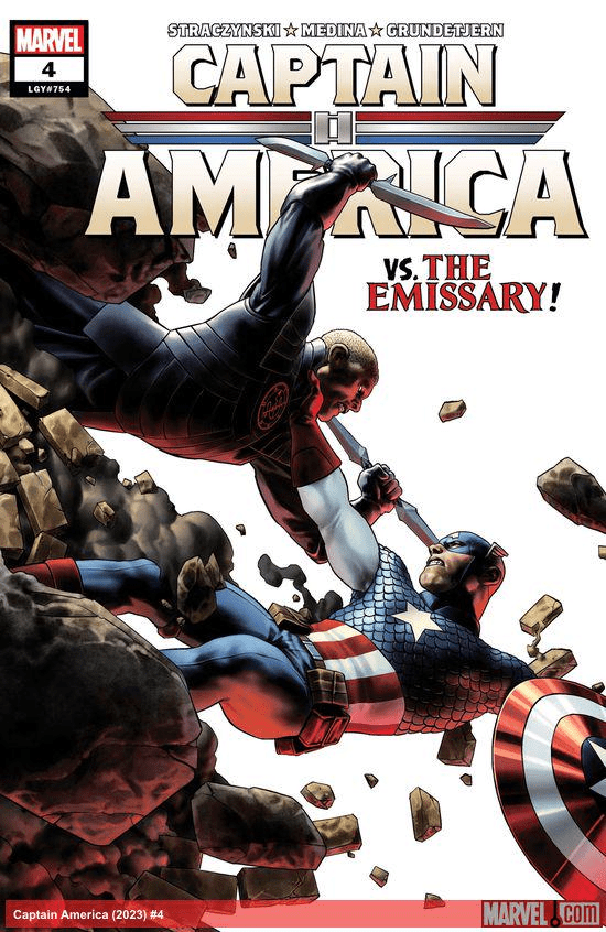 Captain America #4. ”A Series of Unexpected Attacks” Written by J. Michael Straczynski and art by Lan Medina. Jesus Saiz did the cover art. Cap gets messed up by the demon he was facing called The Emissary. We also see back in Steve Rogers’ past the dangers of a hidden bomb. Love this series.