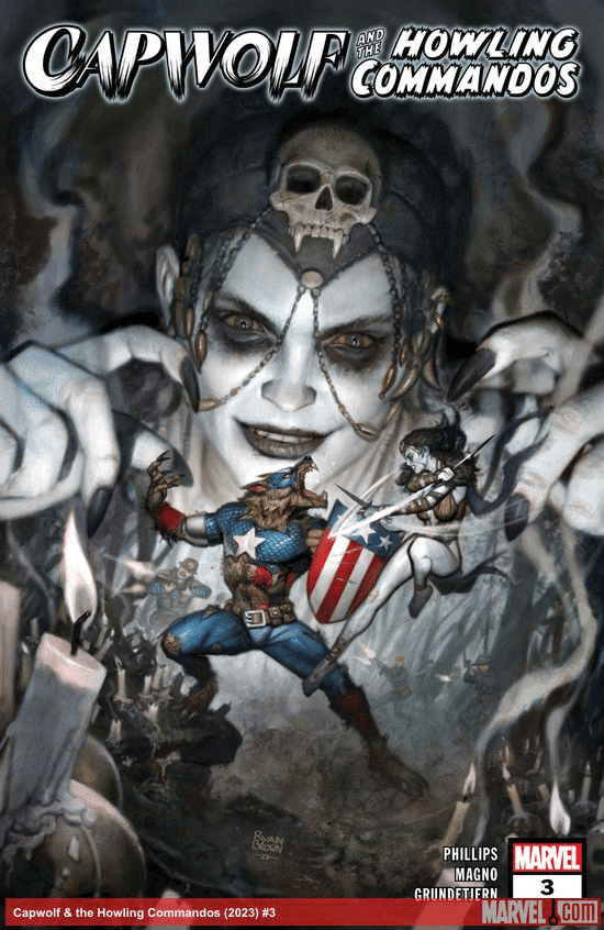 Capwolf and the Howling Commandos #3. Written by Stephanie Phillips and art by Carlos Magno. Ryan Brown did the cover art. Capwolf continues to fight in the World War II battle. Looks as if old Nick Fury may be coming back to the action.