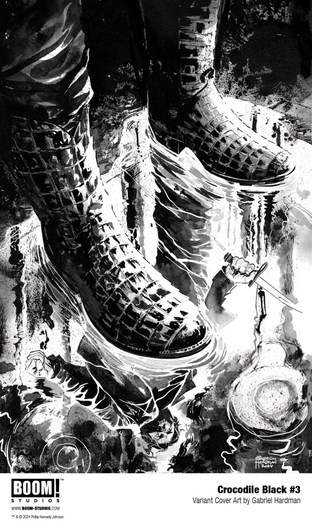 I typically am not a huge fan of the virgin variant covers, but there is no denying that this is a beautiful piece of art, with the focus on these crocodile boots, reflecting in the pool of water. The black and white coloring makes it all the more appealing.
