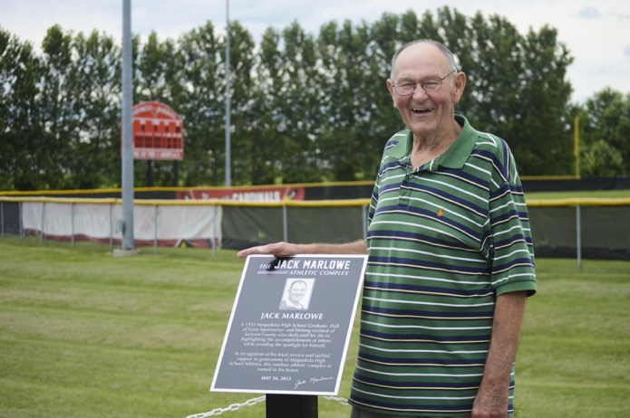 The plague at the Jack Marlowe Athletic Complex read, “A 1953 Maquoketa High School Graduate, Hall of Fame Sportswriter and lifelong resident of Jackson County who dedicated his life to highlighting the accomplishments of others while avoiding the spotlight for himself.”