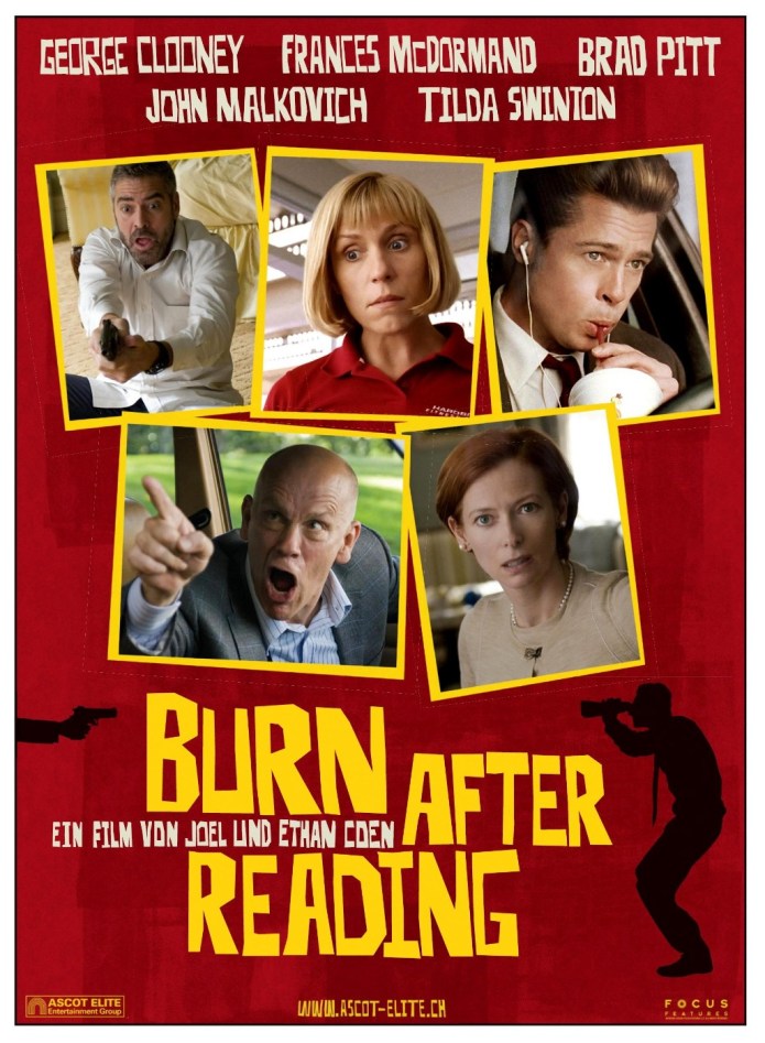 According to IMDB: “Osbourne Cox (John Malkovich), a Balkan expert, resigned from the CIA because of a drinking problem, so he begins a memoir. His wife (Tilda Swinton) wants a divorce and expects her lover, Harry (George Clooney), a philandering State Department marshal, to leave his wife. A CD-ROM falls out of a gym bag at a Georgetown fitness center. Two employees there try to turn it into cash: Linda (Frances McDormand), who wants money for cosmetic surgery, and Chad (Brad Pitt), an amiable goof. Information on the disc leads them to Osbourne who rejects their sales pitch; then they visit the Russian embassy. To sweeten the pot, they decide they need more of Osbourne’s secrets. Meanwhile, Linda’s boss (Richard Jenkins) likes her, and Harry’s wife leaves for a book tour. All roads lead to Osbourne’s house.”
