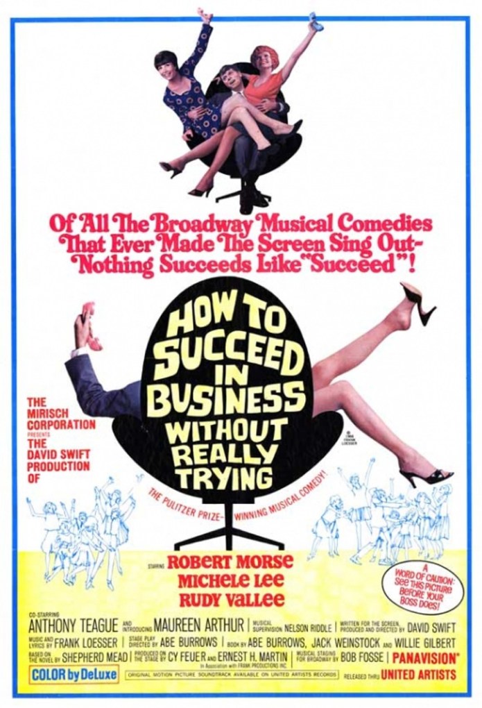 According to IMDB, “Twenty-seven year old New York window washer, J. Pierrepont Finch (Robert Morse), believes he can be a success in the corporate world after he impulsively picks up the book “How to Succeed in Business Without Really Trying“. The book promises its reader that he can climb the corporate ladder simply and quickly. The Worldwide Wicket Corporation, the business in the office building whose windows he washes is, according to the book, the perfect type of business. There he meets secretary Rosemary Pilkington (Michele Lee), who sees in Ponty (as she calls him) an unassuming man who she believes the corporate world will eat alive. But Ponty, memorizing what the book tells him, does quickly climb the corporate ladder but not by doing any real work.”