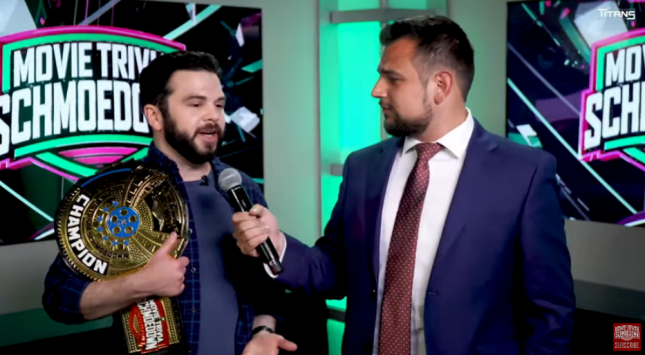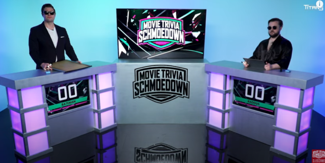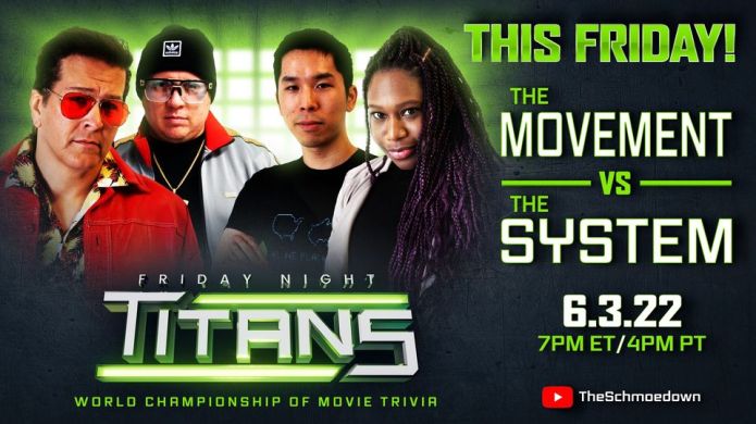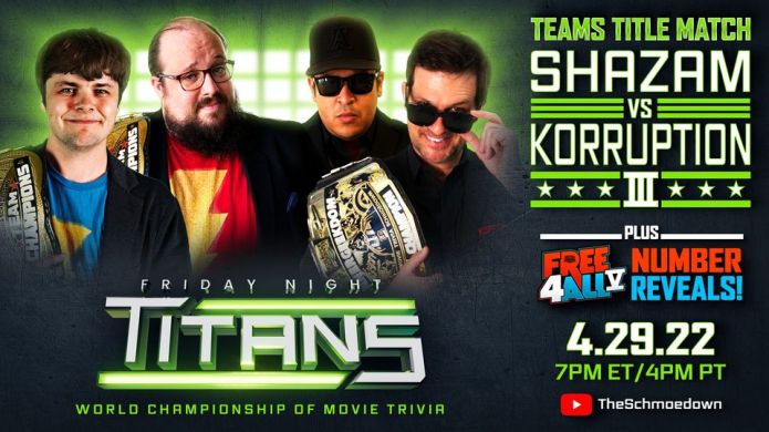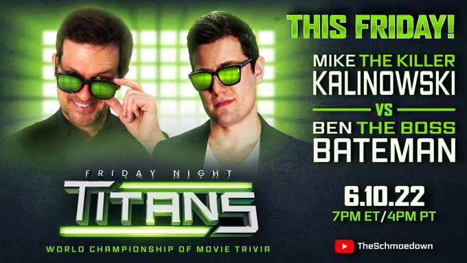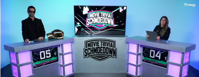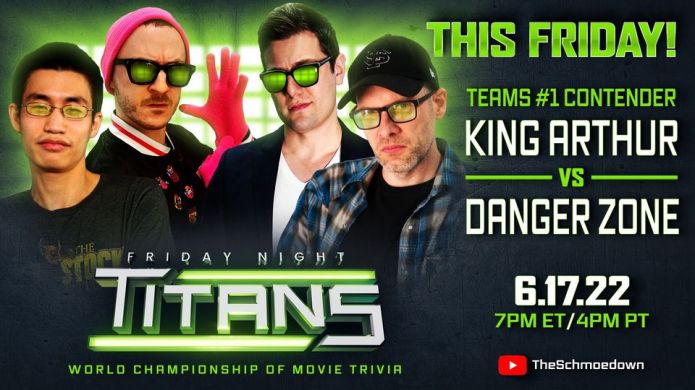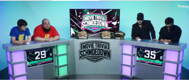 The new week of the Movie Trivia Schmoedown’s flagship program, Friday Night Titans, arrived on YouTube tonight with a very intriguing show. I made a comment last week about the main event this week being a “squash match,” borrowing the pro wrestling term, with the new team The Appointment of Mr. Erwin and Slick Nick taking on Eric Zipper and Adam Gertler. I just did not find that to be main event worthy.