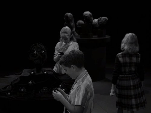 “Tonight’s story on The Twilight Zone is somewhat unique and calls for a different kind of introduction. This, as you may recognize, is a map of the United States, and there’s a little town there called Peaksville. On a given morning not too long ago, the rest of the world disappeared and Peaksville was left all alone. Its inhabitants were never sure whether the world was destroyed and only Peaksville left untouched or whether the village had somehow been taken away. They were, on the other hand, sure of one thing: the cause. A monster had arrived in the village. Just by using his mind, he took away the automobiles, the electricity, the machines—because they displeased him—and he moved an entire community back into the dark ages—just by using his mind. Now I’d like to introduce you to some of the people in Peaksville, Ohio. This is Mr. Fremont. It’s in his farmhouse that the monster resides. This is Mrs. Fremont. And this is Aunt Amy, who probably had more control over the monster in the beginning than almost anyone. But one day she forgot. She began to sing aloud. Now, the monster doesn’t like singing, so his mind snapped at her, turned her into the smiling, vacant thing you’re looking at now. She sings no more. And you’ll note that the people in Peaksville, Ohio have to smile. They have to think happy thoughts and say happy things because, once displeased, the monster can wish them into a cornfield or change them into a grotesque, walking horror. This particular monster can read minds, you see. He knows every thought, he can feel every emotion. Oh yes, I did forget something, didn’t I? I forgot to introduce you to the monster. This is the monster. His name is Anthony Fremont. He’s six years old, with a cute little-boy face and blue, guileless eyes. But when those eyes look at you, you’d better start thinking happy thoughts, because the mind behind them is absolutely in charge. This is the Twilight Zone.”