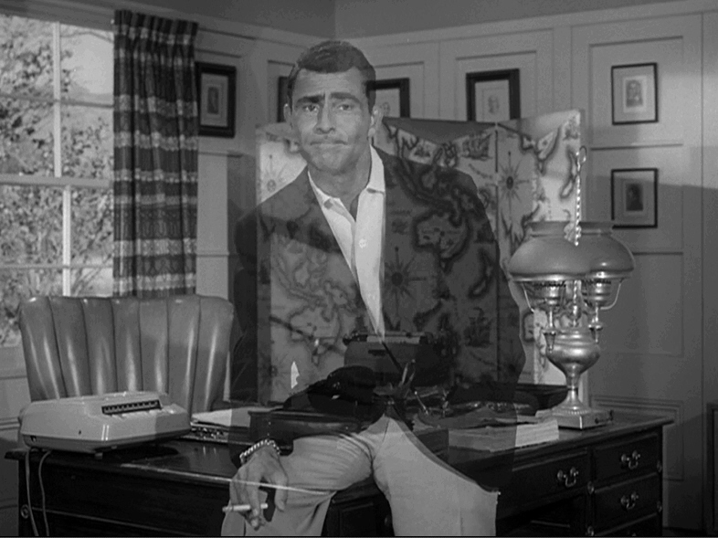 “This is Gart Williams, age thirty-eight, a man protected by a suit of armor all held together by one bolt. Just a moment ago, someone removed the bolt, and Mr. Williams’ protection fell away from him, and left him a naked target. He’s been cannonaded this afternoon by all the enemies of his life. His insecurity has shelled him, his sensitivity has straddled him with humiliation, his deep-rooted disquiet about his own worth has zeroed in on him, landed on target, and blown him apart. Mr. Gart Williams, ad agency exec, who in just a moment, will move into the Twilight Zone—in a desperate search for survival“