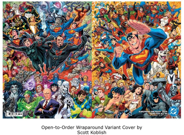 Superman Treasury 2025: Hero for All #1. Written by Dan Jurgens and art by Bruno Redondo. Scott Koblish did the variant cover C art. In honor of the new film, Superman gets his own Treasury Edition comic original story with a large scale invasion of the earth. After Superman is sidetracked and held captive, the heroes of earth struggle to defend the planet. I enjoyed this book quite a bit, even though it is difficult to find a bag and a board to fit it. Go see Superman in theaters when you have a chance.